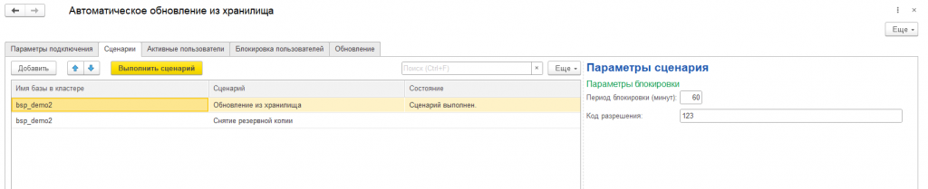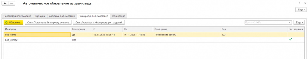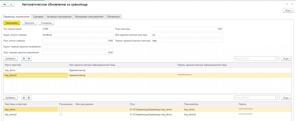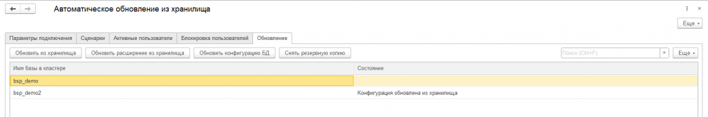 Автоматическое обновление базы из хранилища я разделил на несколько шагов: установка блокировки сеансов, завершение активных сеансов, обновление основной конфигурации из хранилища, обновление расширения из хранилища и снятие блокировки сеансов пользователей.