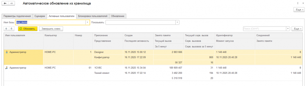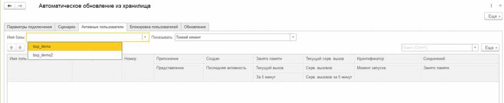 Список информационных баз используется в дальнейшем в реализованных инструментах, например, в настройке сценариев или при просмотре активных пользователей