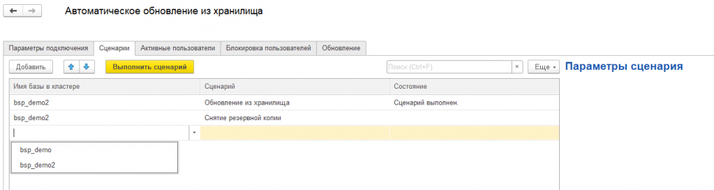 Параметры сценария при этом заполняются на вкладке с сценариями, но сохраняются вместе со всеми настройками на первой странице. Параметры зависят от того, какие шаги выбраны в сценарии.