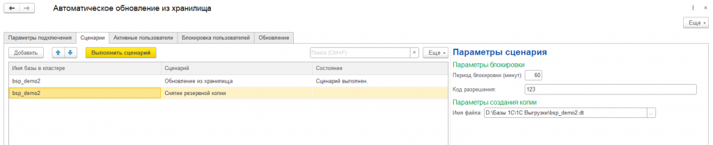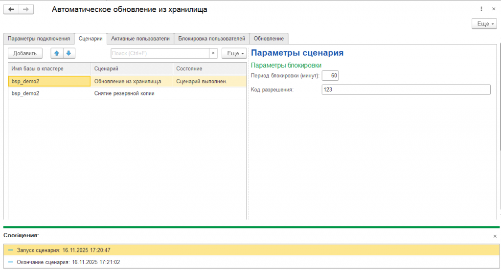 Автоматическое обновление базы из хранилища я разделил на несколько шагов: установка блокировки сеансов, завершение активных сеансов, обновление основной конфигурации из хранилища, обновление расширения из хранилища и снятие блокировки сеансов пользователей.