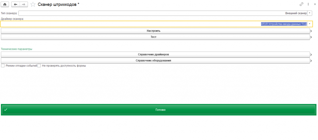 Для того чтобы работал встроенный сканер ТСД, нужно зайти в "настройки"- "сканер штрихкодов" - выбрать тип сканера "внешний сканер" - выбрать драйвер сканера в зависимости от производителя устройства - записать настройки и выполнить тест сканирования. После этого можно пользоваться встроенным лазерным сканером ТСД и интегрировать сканирование в свои формы.