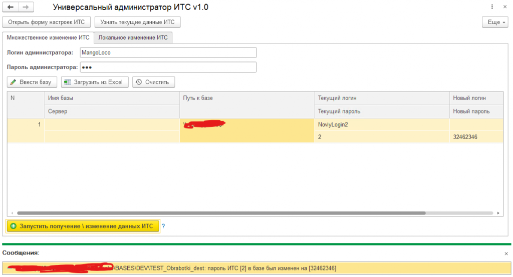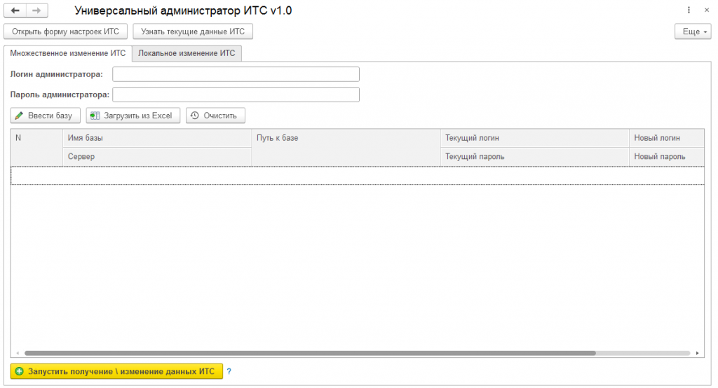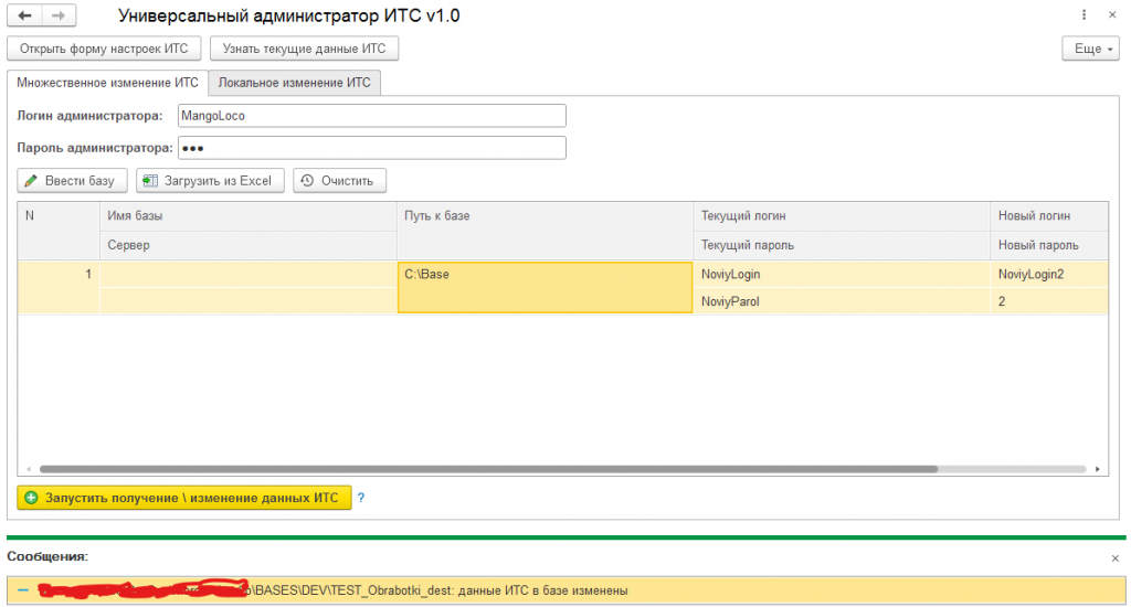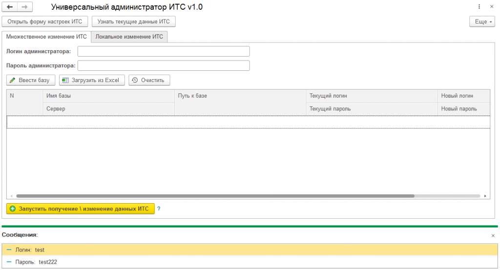 И напоследок нужно указать логин и пароль пользователя в базах, в которые будет производиться смена данных. Сделать это можно в полях "Логин администратора" и "Пароль администратор" сразу под вкладкой "Множественное изменение ИТС".