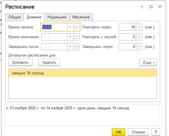 Перейдите в Обслуживание → Регламентные операции и настройте расписание автоматического запуска (например, каждые 10 секунд).