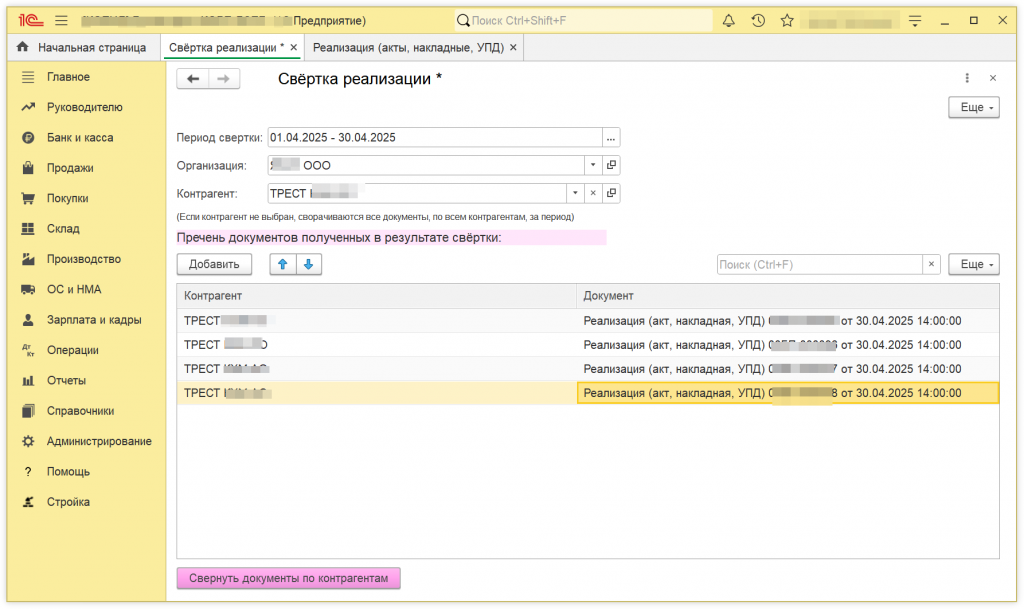 Выборка происходит по договорам, т.е. сколько договоров контрагента было в реализации в этом периоде, столько и будет создано итоговых документов. Табличные части, отличные от "Товары" или "Услуги", игнорируются.
