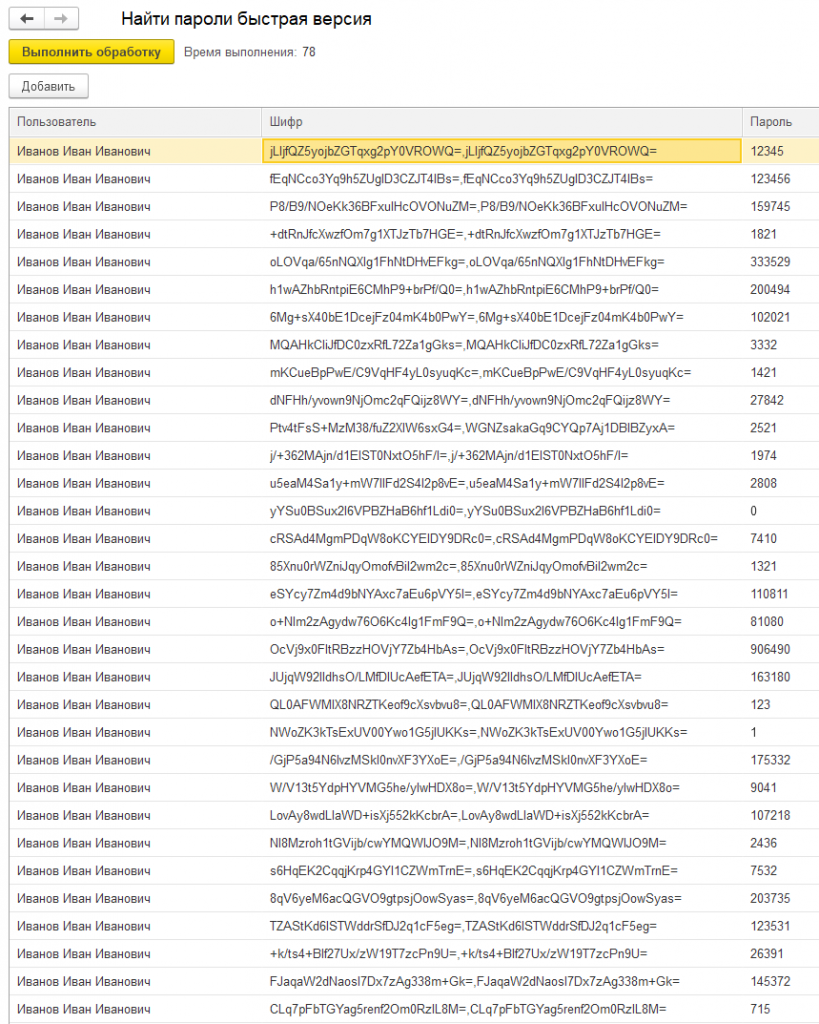 Результат: Когда находится совпадение, подобранный числовой пароль записывается в соответствующую строку таблицы обработки в колонку "Пароль".