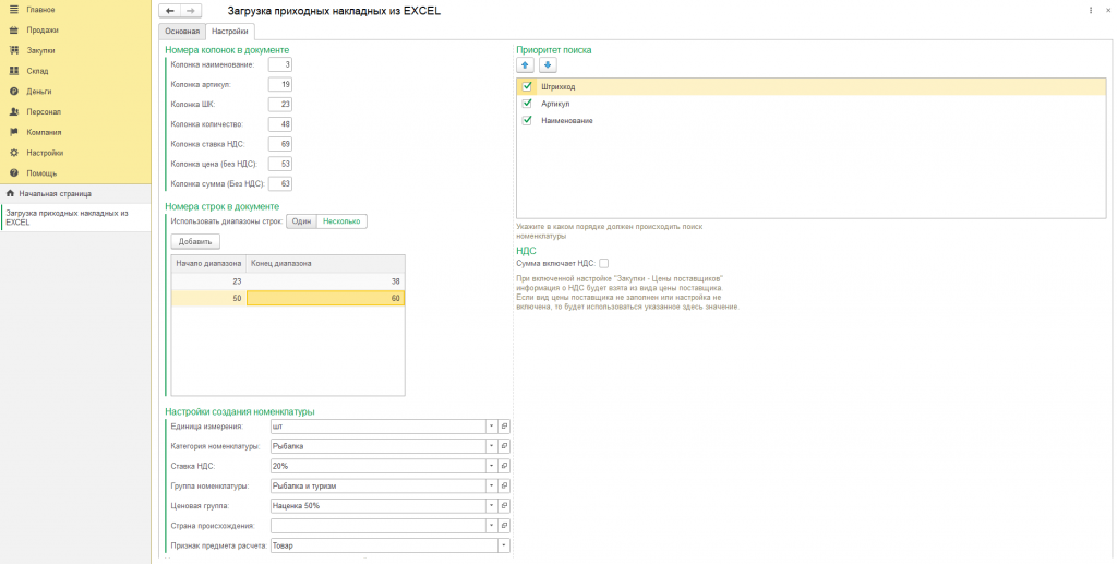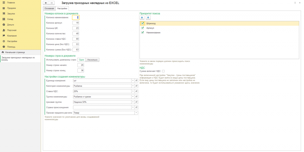 1. На вкладке Настройки необходимо заполнить поля с номерами колонок и строк, настройки для создания новой номенклатуры, а также указать приоритет поиска.