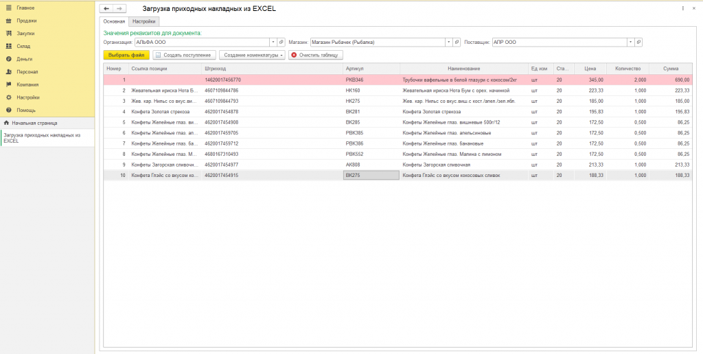 Загрузка поступлений из Excel в 1С:Розница 3.0