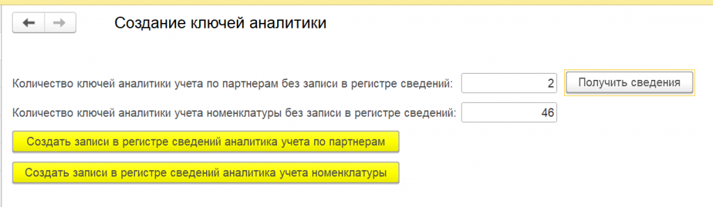 Обработка анализирует записи в регистрах сведений АналитикаУчетаПоПартнерам и АналитикаУчетаНоменклатуры и создает записи по отсутствующим ключам.