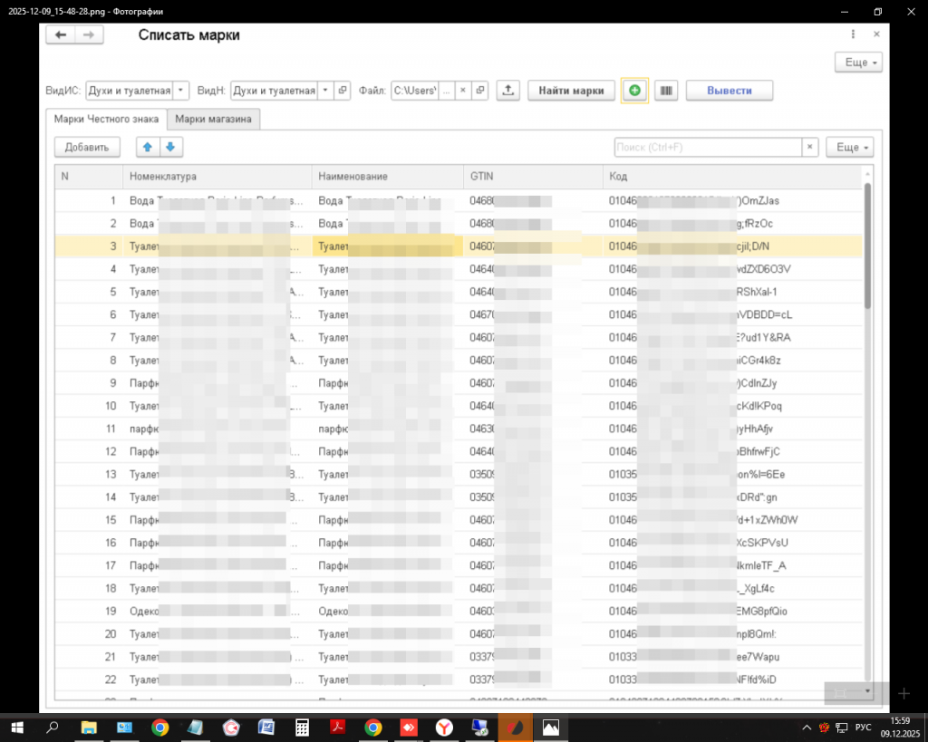 2. Сканируем все марки в магазине по выбранной товарной группе в табличку Excel в столбец Код.