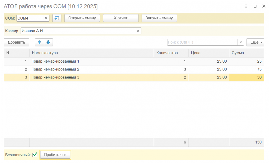 После того, как вы примените свои настройки, вам необходимо будет открыть смену соответствующей кнопкой. Далее, набрав товары в табличной части, нажимаете "Пробить чек". Для безнального чека - достаточно поставить галочку "Безналичный чек". Для проверки вы можете снять "Х-отчет" или "Закрыть смену".