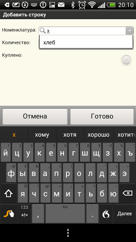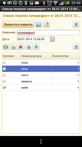Режимом "Покупки" удобно пользоваться находясь в магазине - при открытии определенного списка покупок открывается "специальная" форма редактирования, в которой одним тапом можно отметить позицию "Купленной" - она становится зачеркнутой (условное оформление формы) и переносится в нижнюю часть списка. Как известно, в мобильной платформе при начале редактирования строки табличной части открывается отдельная форма, поэтому, чтобы реализовать эту функцию, пришлось прописать обработчик события ПередНачаломИзменения() таблицы формы.