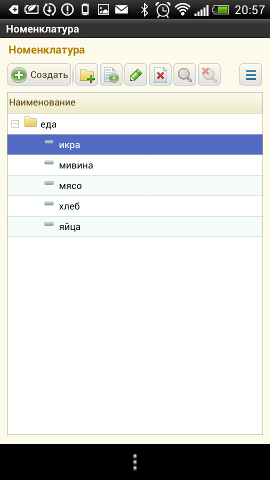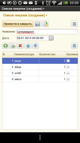 В режиме "Создание" при открытии списка открывается обычная форма редактирования, в которой удобно составлять списки перед походом в магазин. Для удобства подбора уже использованных ранее товаров в конфигурации есть справочник "Номенклатура".