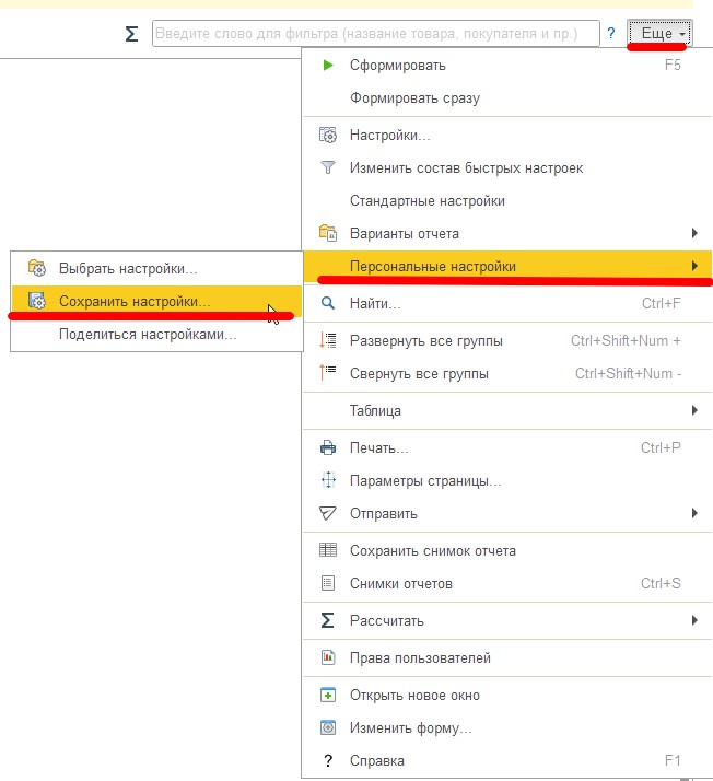 Чтобы каждый раз не указывать необходимые параметры, в 1С присутствует функционал сохранения персональных настроек. Чтобы сохранить параметры, необходимо перейти: Еще - Персональные настройки – Сохранить настройки, после чего откроется форма, где необходимо ввести название настроек и сохранить. (Рис.4)
