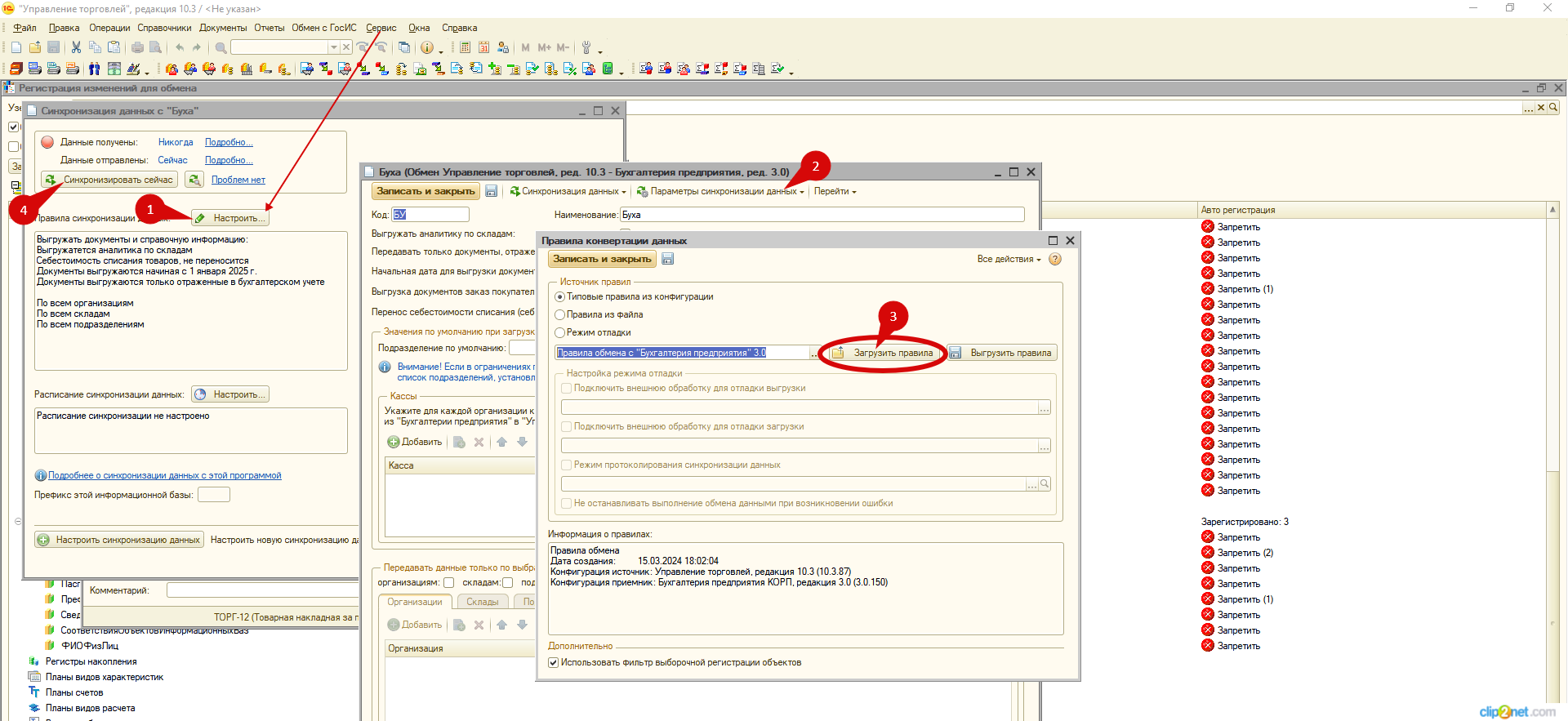 4. После обновления запускаем 1С и в настройке обмена с бухгалтерией жмём "Загрузить правила"