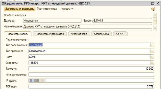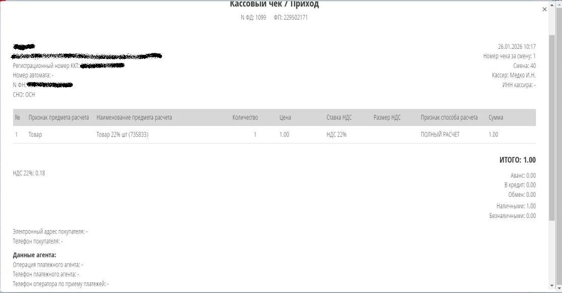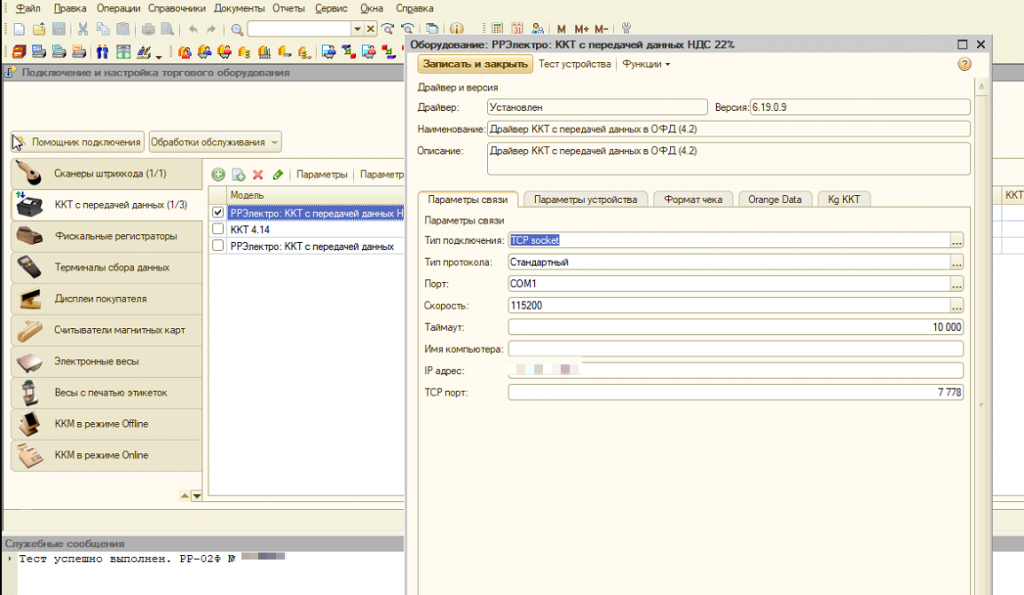 Оборудование проходит тест подключения. Чеки пробиваются и уходят в ОФД.