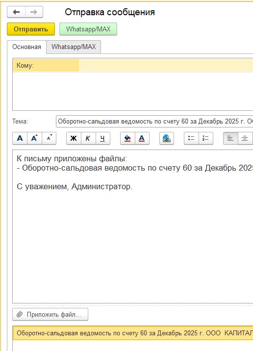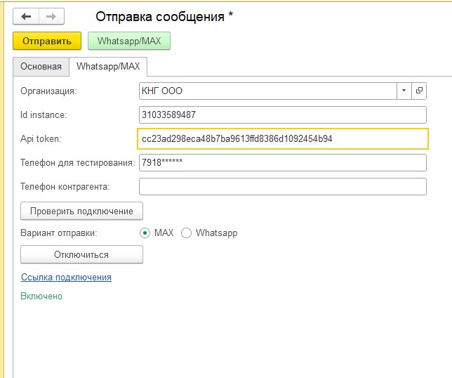 Чтобы убедиться в правильности ввода реквизитов, жмем "Проверить подключение". Ниже должна появиться надпись, что включено. Жмем зеленую кнопку "WhatsApp/МАХ". Сообщение (Тема письма) с вложениями уходит на номер телефона Контрагента. Но если Вы вручную ввели номер телефона для тестирования, то у него приоритет выше, и сообщение уйдет на номер для тестирования.