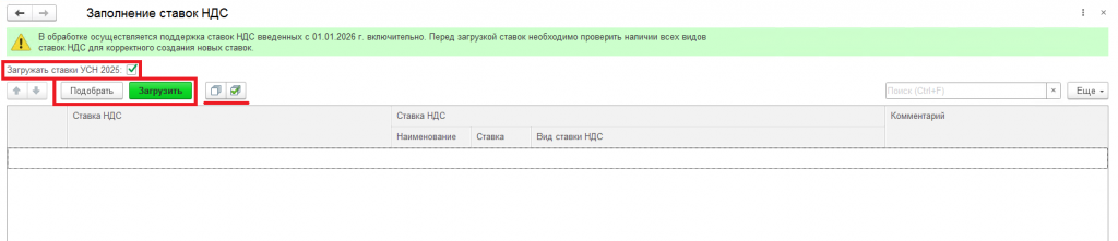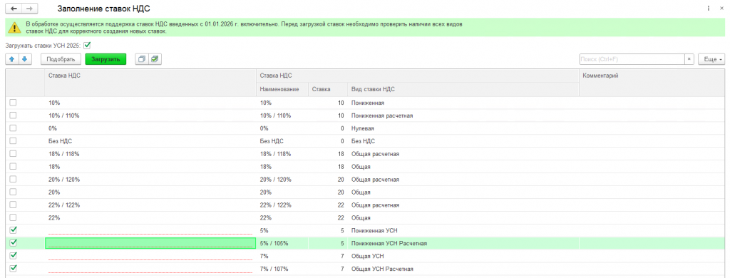 Команда «Подобрать» заполняет список ставками НДС, предназначенными для загрузки. Алгоритмы формирования этого списка были реализованы на основе обработчиков обновления УНФ версии 3.0.12.226 от 12.12.2025.