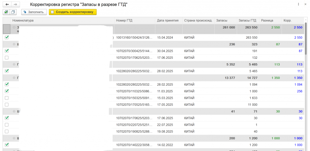 Сделали обработку по сверке количества товара в регистре Запасы и Запасы в разрезе ГТД.