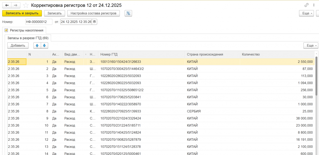 Списание старых ГТД, которых нет на остатке, из регистра Запасы в разрезе ГТД