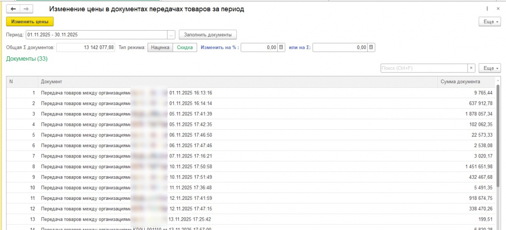Изменение цены в документе Передача товаров между организациями (за период) в УТ 11.5, КА 2.5