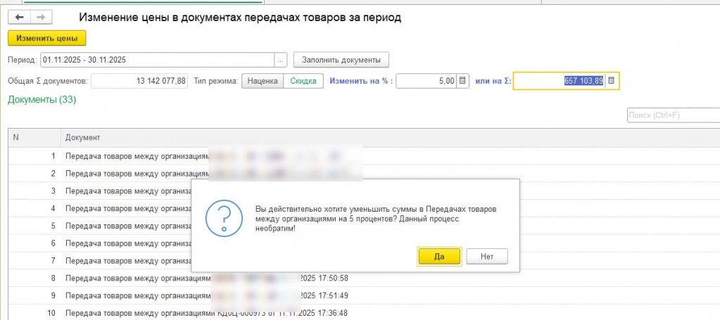 Чтобы использовать обработку, необходимо сначала выбрать период и нажать команду Заполнить документы. После заполнения документов появится общая сумма по всем передачам товаров за период. Далее выбираем, что нужно: увеличить или уменьшить сумму. Можно указать процент, тогда автоматически заполнится сумма изменения, или указать сумму, которую хотим распределить, тогда заполнится процент увеличения. После нажатия Изменить цены выдается вопрос, после Нажатия "Да" начинается изменение (проведение) документов.