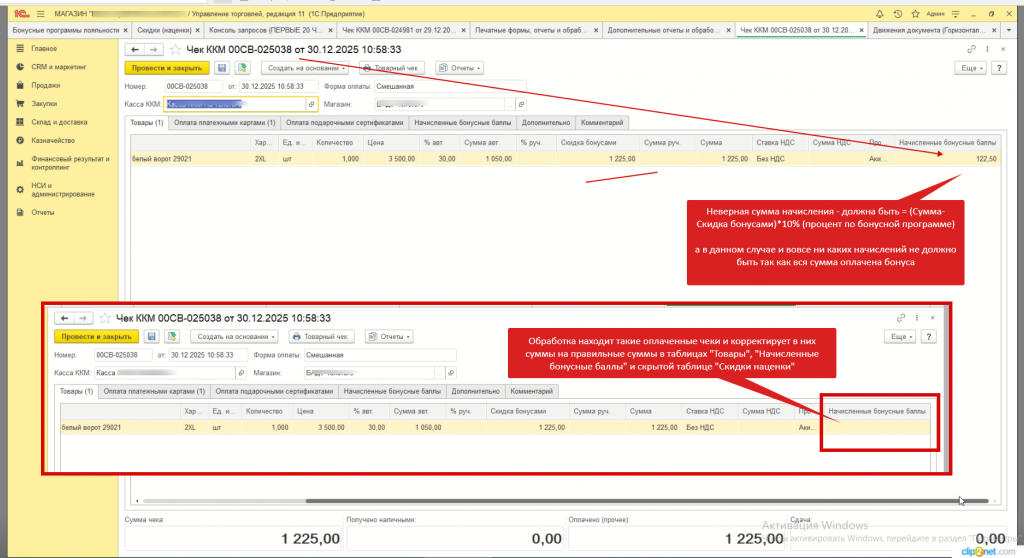 * Не стал ломать типовые программные алгоритмы начисления бонусных баллов, а сделал внешнюю обработку, которая периодически находит такие оплаченные чеки и корректирует в них сумму на правильную.