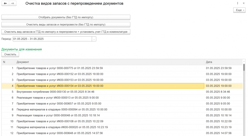 5. Отобрать документы, очистить виды запасов и перепровести (первые две команды обработки).