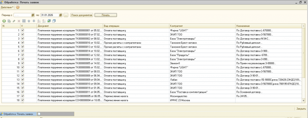 Поиск платежных поручений по периоду: с помощью удобного выбора периода находит все документы «Платежное поручение исходящее» за заданный интервал и заполняет список с основными реквизитами – контрагент, вид операции, назначение платежа.