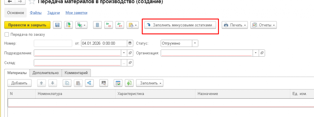 • Пользователь открывает документ «Передача материалов в производство» и нажимает команду «Заполнить минусовыми остатками».
