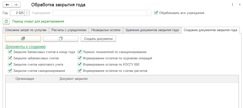 Если в БД ещё не было документов закрытия года, то на 4 вкладке ("удаление") будет пусто и можно сразу переходить на 5 ("создание"). Здесь можно создавать документы, предварительно указав какие именно: