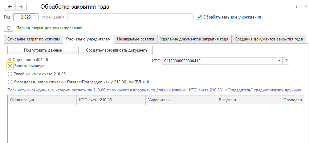 Эта обработка была опробована и в целом устраивала, однако её возможностей оказалось недостаточно для работы с централизованными бухгалтериями. Поэтому я взял её за основу и переработал для запуска в базах, в которых ведётся учёт по нескольким учреждениям. Также добавил функционал для закрытия 109 счёта и корректировки расчётов с учредителем по счёту 210.06.