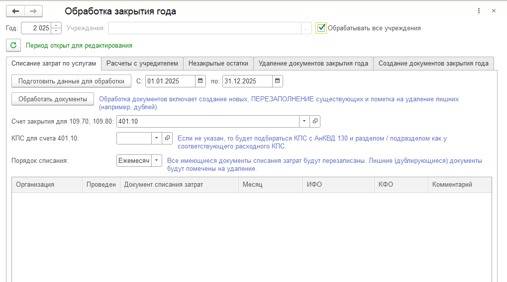 По кнопке "Подготовить данные для обработки" собираются все комбинации "ИФО/КФО/Организация" для закрытия в указанном периоде.