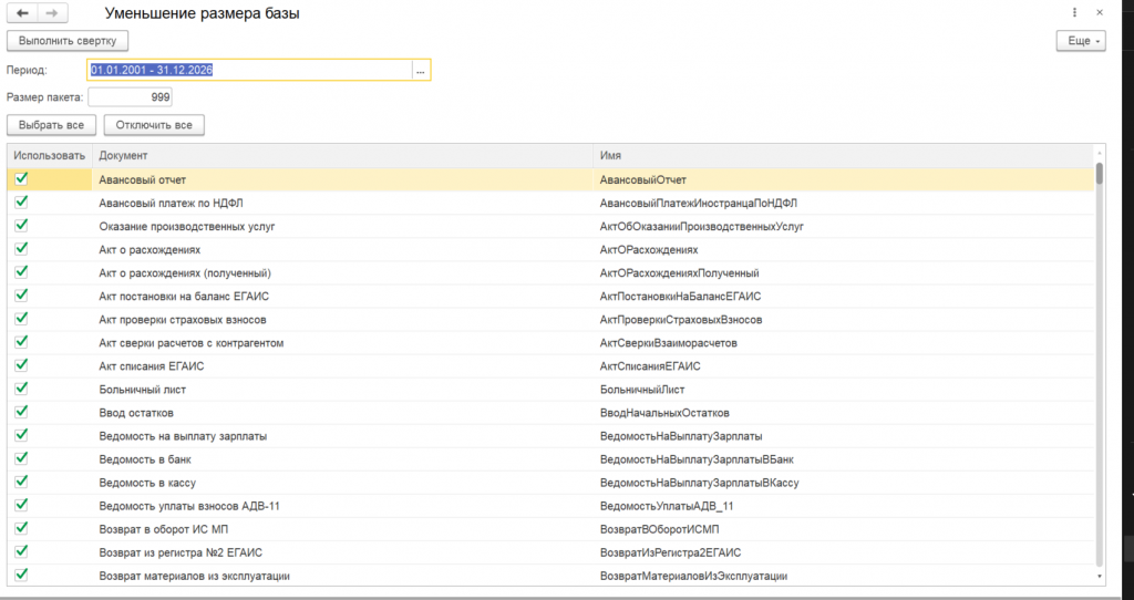 Обработка автоматически получает список всех документов конфигурации, даёт возможность выбрать, какие из них участвуют в очистке, задать период, размер пакета и выполнить процесс по шагам. Для каждого документа в выбранном периоде очищаются все табличные части, документ перезаписывается в режиме ОбменДанными.Загрузка = Истина, что позволяет безопасно сохранить его “каркас” (шапку, движения и историю) даже с пустыми табличными частями.