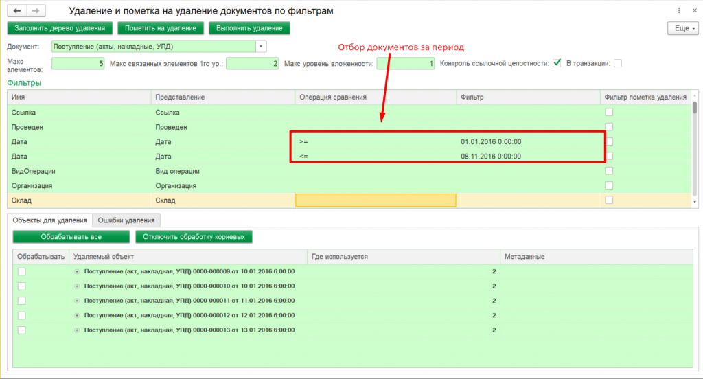 Обработка «Удаление и пометка на удаление документов по фильтрам» дает возможность выборочно удалять документы любого типа, заполняя дерево удаляемых объектов по настраиваемым фильтрам и управляя глубиной захвата связанных данных.