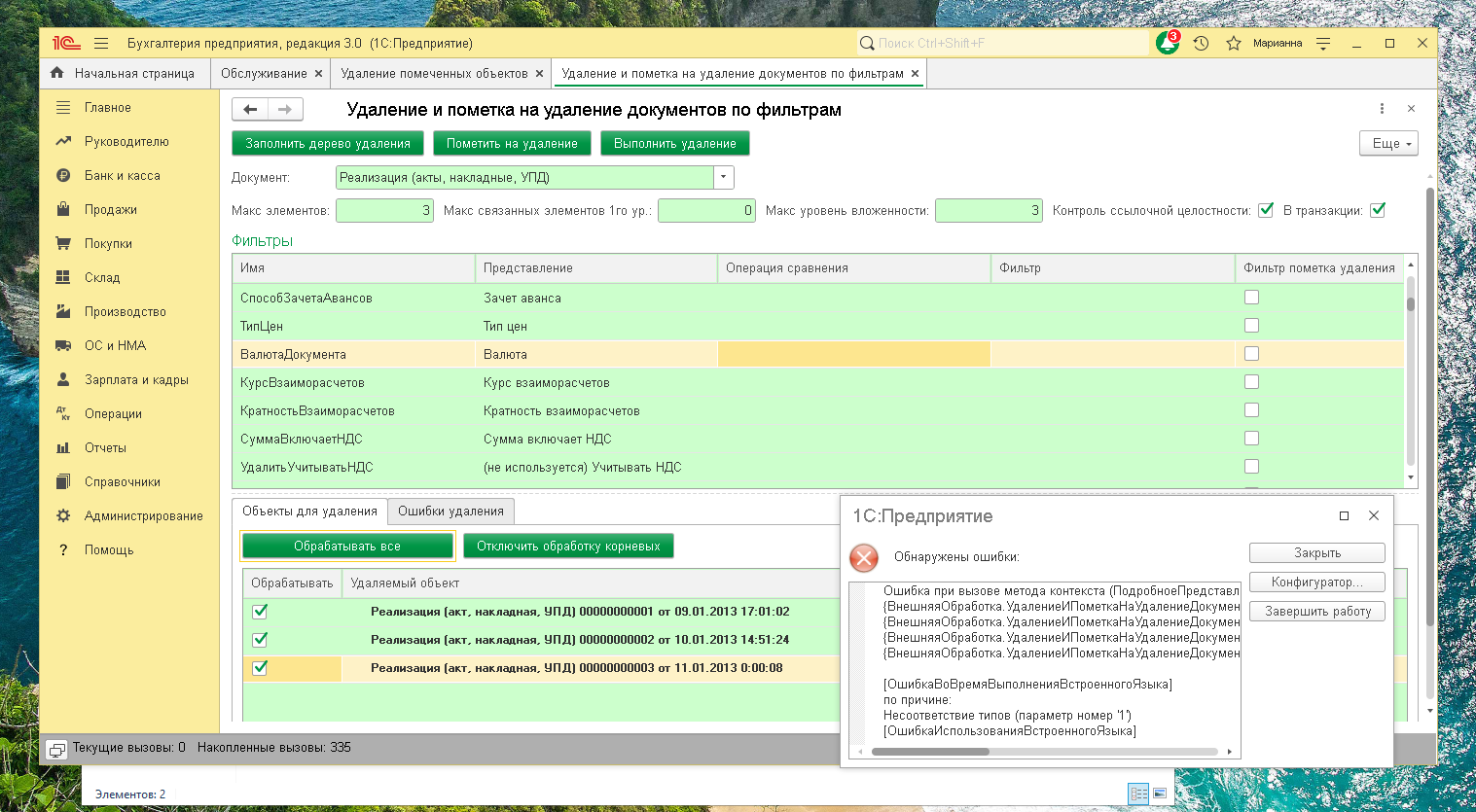 Обработка «Удаление и пометка на удаление документов по фильтрам» дает возможность выборочно удалять документы любого типа, заполняя дерево удаляемых объектов по настраиваемым фильтрам и управляя глубиной захвата связанных данных.