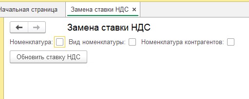 При интерактивном изменении ставки необходимо установить галочки, в зависимости от того, какой справочник/регистр нужно обновить. После этого нажимаем кнопку "Обновить ставку НДС".