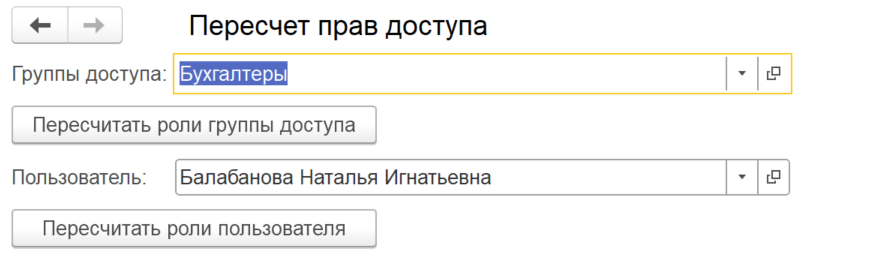Подключаемая внешняя обработка, позволяющая запустить пересчет прав доступа по выбранной группе или по выбранному пользователю.