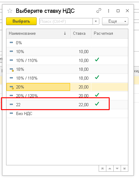 Система показывает диалог ввода значения с типом «СправочникСсылка.СтавкиНДС» и текущей ставкой по умолчанию (введите 22%+).