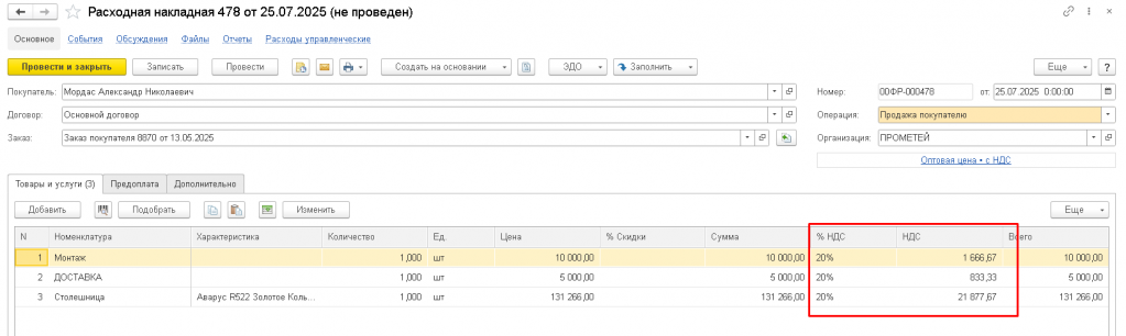 Документ готов к сохранению и печати с обновлёнными НДС, суммами и итогами по новой ставке – исходный заказ остаётся неизменным.