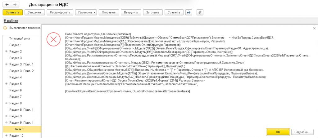 При заполнении корректировочной декларации и формировании книги продаж с доп. листами за 2025 год возникает модульная ошибка