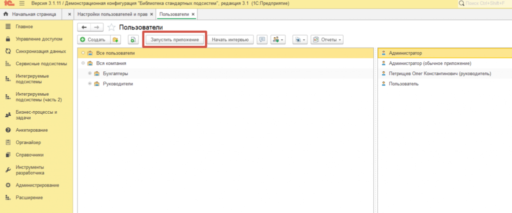 После подключения расширения и добавления роли пользователю в списке пользователей появится кнопка "Запустить приложение". По нажатию на кнопку будет запущен тонкий клиент с авторизацией под выбранным пользователем.