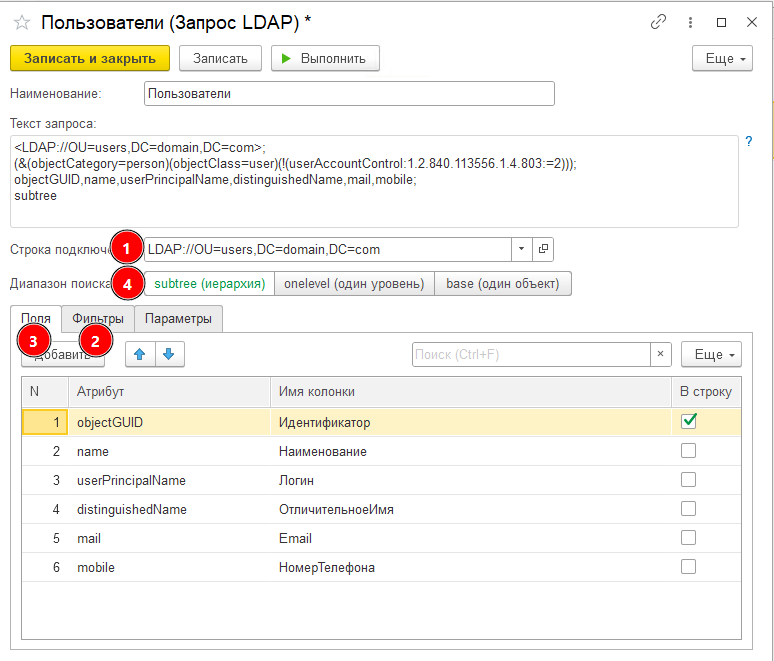 - Диапазон поиска - выбирать объекты AD только из указанного в запросе расположения или включать объекты вложенных уровней (при большом количестве объектов AD ограничивает количество выбираемых объектов и можно отключать иерархию для уменьшения размера выборки).