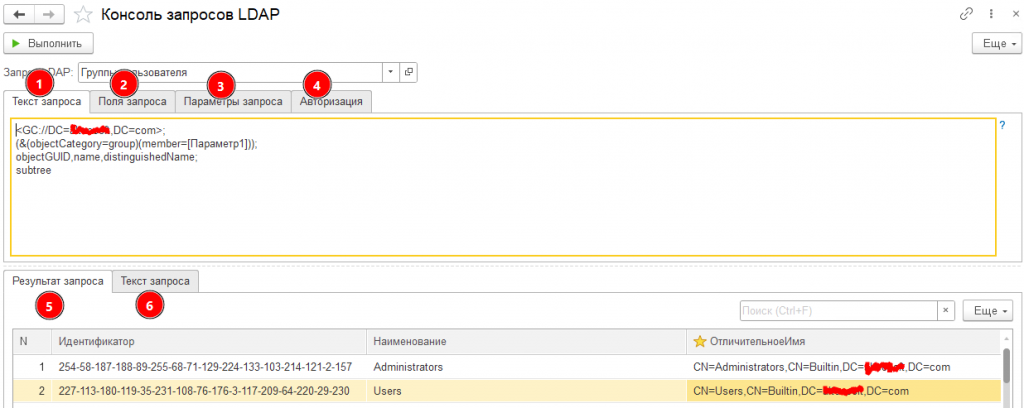 - Исходный текст запроса из Справочник.дпЗапросыLDAP или ручной ввод, редактирование текста запроса.
