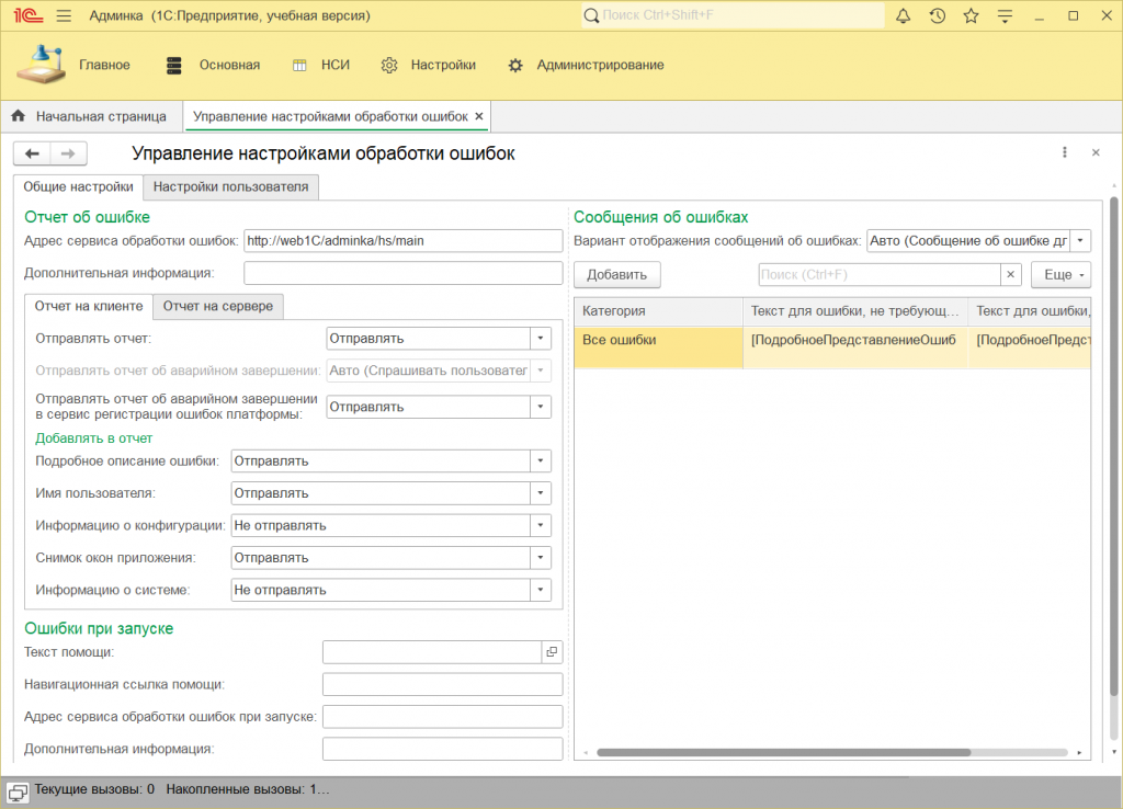 Для сбора информации по ошибкам, дополнительно необходимо в каждой базе настроить форму обработки ошибок и указать адрес сервиса: например http://web1C/adminka/hs/main
