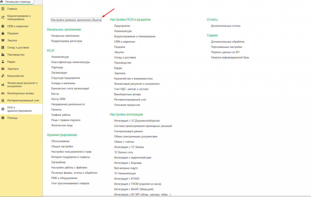 В подсистеме "Администрирования" появится "Настройка проверки заполнения объекта".