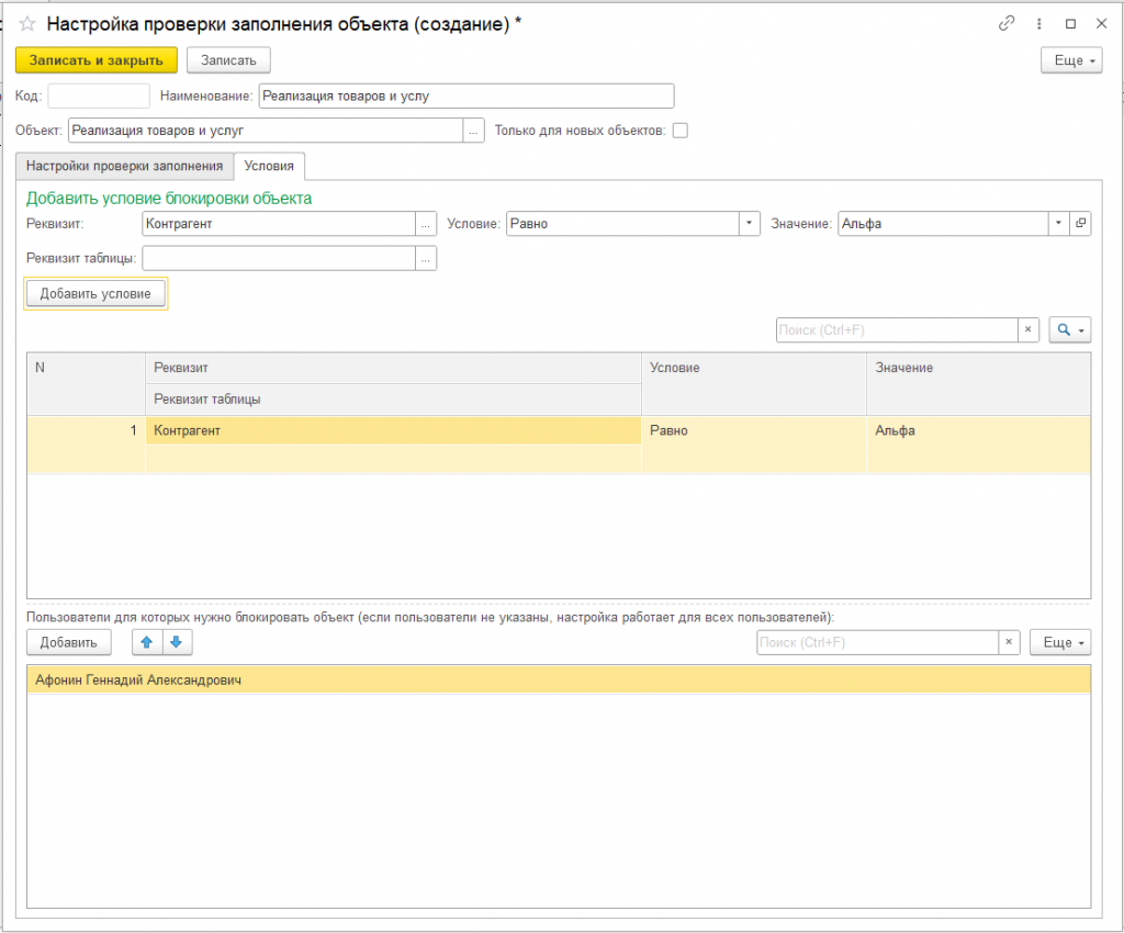 В таблицы "Пользователи" добавляем пользователей, для которых будет срабатывать блокировка объекта, если пользователи не указаны, настройка работает для всех пользователей.
