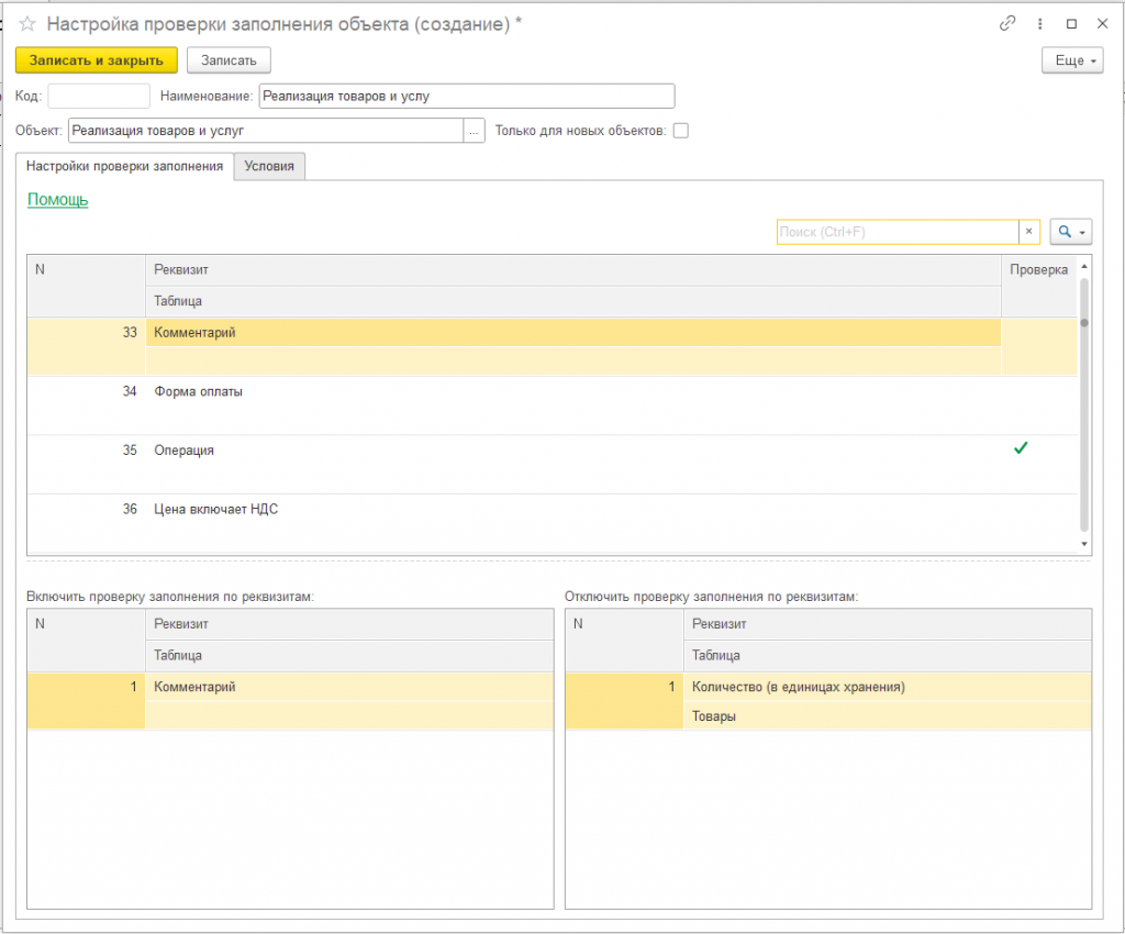 Настройка проверки заполнения реквизитов объектов