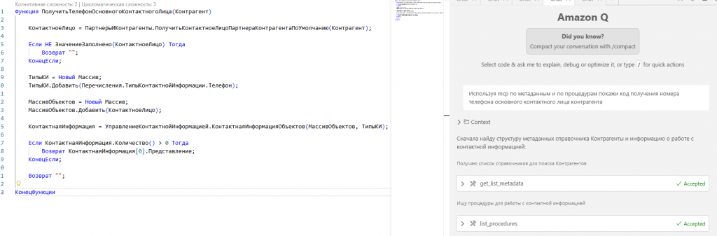 После подключения ИИ-модель сможет анализировать доступные функции конфигурации и применять их.