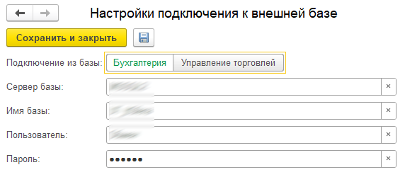 - "Пароль" - строковое поле, пароль для подключения к внешней базе.