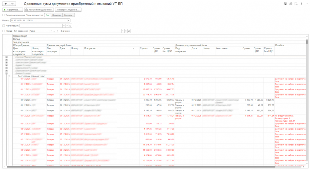 - Ошибки - вывод ошибок, которые выявлены при сопоставлении. 3 варианта ошибок: документ не найден в подключаемой базе, документ не найден в текущей базе и не сходятся суммы или суммы НДС сопоставленных документов.